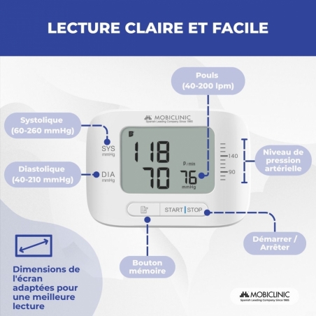 MEMORIA : Il dispose d'un bouton mémoire permettant d'enregistrer jusqu'à 99 mesures, pour un suivi détaillé de la tension artérielle au fil du temps. Il propose également une moyenne des trois dernières mesures pour des résultats plus fiables.