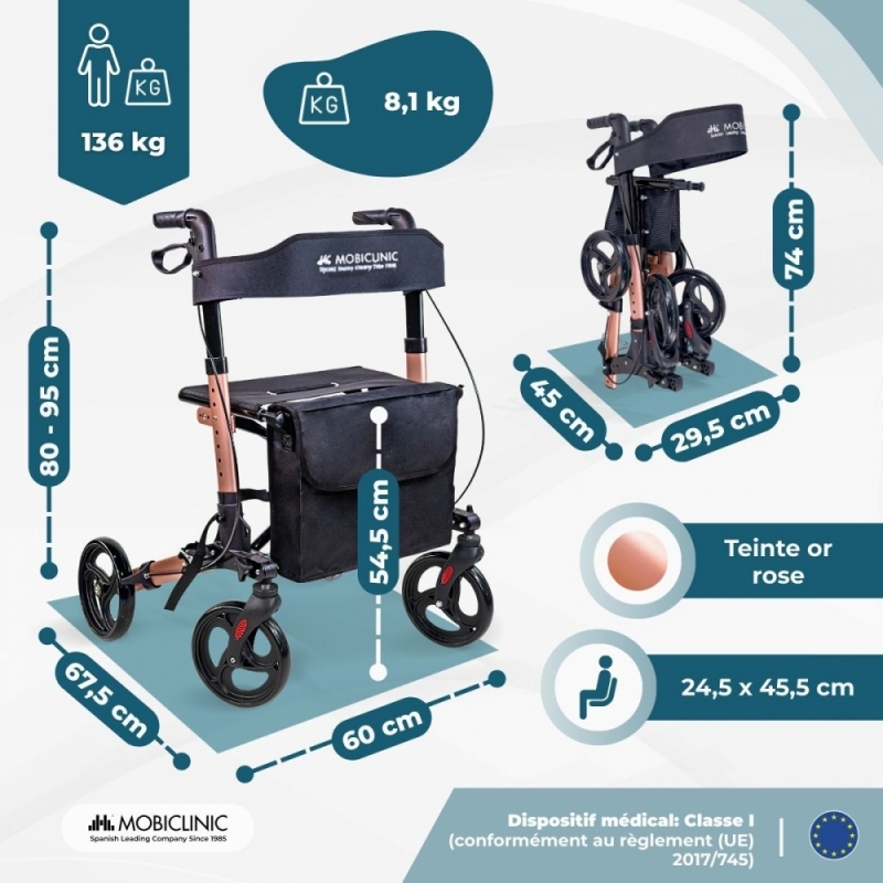 Déambulateur pliable | Aluminium | Jusqu'à 136 kg | Freins à main | Assise et dossier | Or rose | Trajano | Deluxe | Mobiclinic