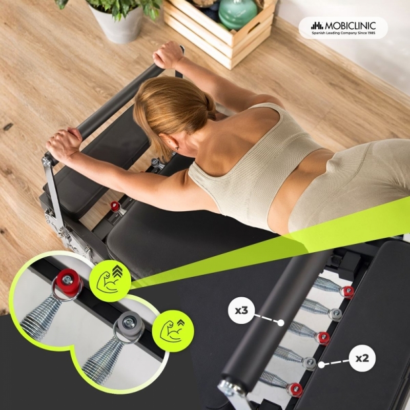 Son système est doté de 5 ressorts de résistance permettant d'ajuster facilement l'intensité de votre entraînement. Il comprend trois ressorts rouges de 20 kg chacun et deux ressorts gris de 7,7 kg chacun, vous permettant de moduler l'effort en fonction de votre programme ou des muscles que vous souhaitez solliciter. Plus le nombre de ressorts est élevé, plus la résistance est importante pendant l'exercice, assurant ainsi une progression contrôlée et sécurisée, adaptée aux objectifs et aux besoins de chaque utilisateur.