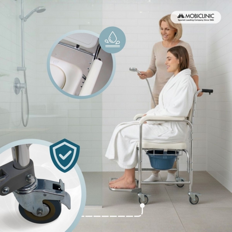 Polyvalente, elle peut servir de chaise percée, de chaise de douche, de rehausseur de toilettes et de chaise de transfert, s'adaptant ainsi aux besoins de tous les utilisateurs. Elle est équipée de freins sur ses quatre roues pour plus de sécurité et pour éviter tout déplacement involontaire.