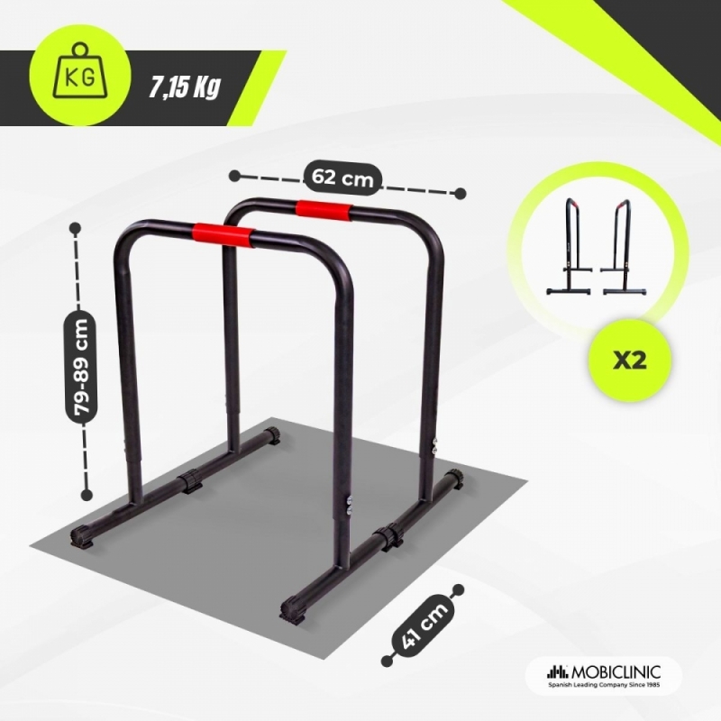 HAUTEUR RÉGLABLE : Ces barres parallèles offrent deux niveaux de hauteur (79 et 89 cm) qui s'adaptent aux besoins de l'utilisateur. Cela vous permet de varier l'intensité de vos entraînements en fonction de votre force et de votre taille. Idéales pour les débutants et les utilisateurs plus expérimentés souhaitant progresser en callisthénie ou en CrossFit à domicile.