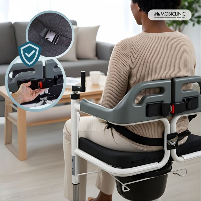 Il est doté d'un double système de sécurité, comprenant une ceinture arrière réglable qui maintient fermement l'utilisateur et un mécanisme de verrouillage automatique du cadre. Il possède également des freins de blocage sur les quatre roues pour une meilleure stabilité lors des transferts, empêchant tout mouvement involontaire.