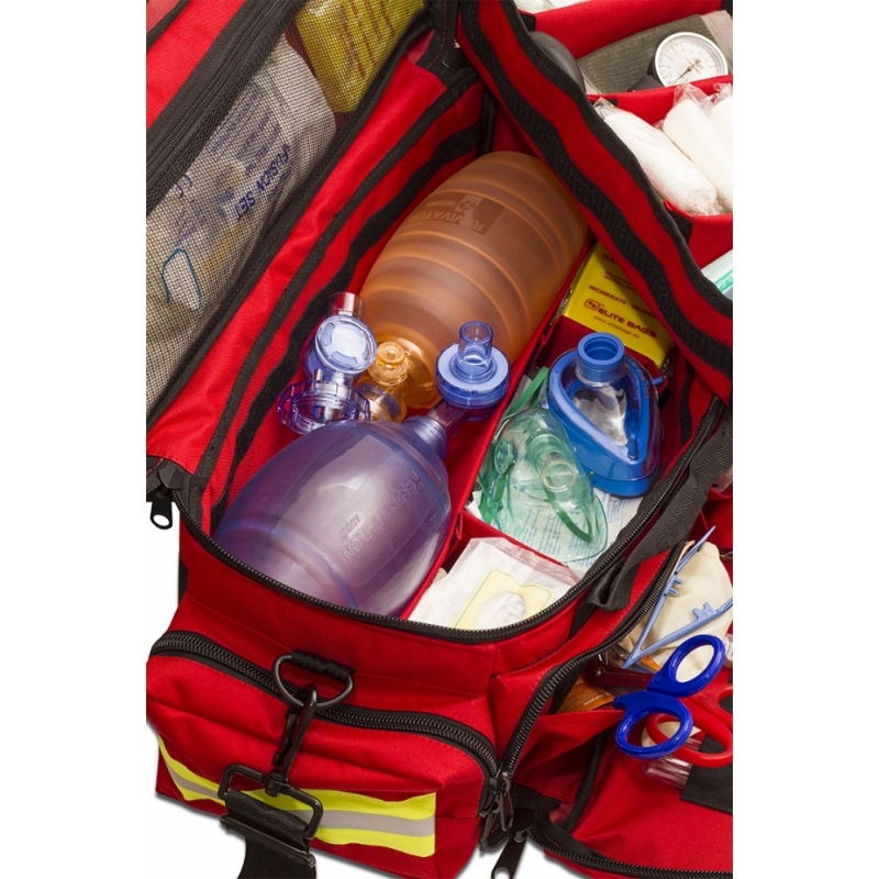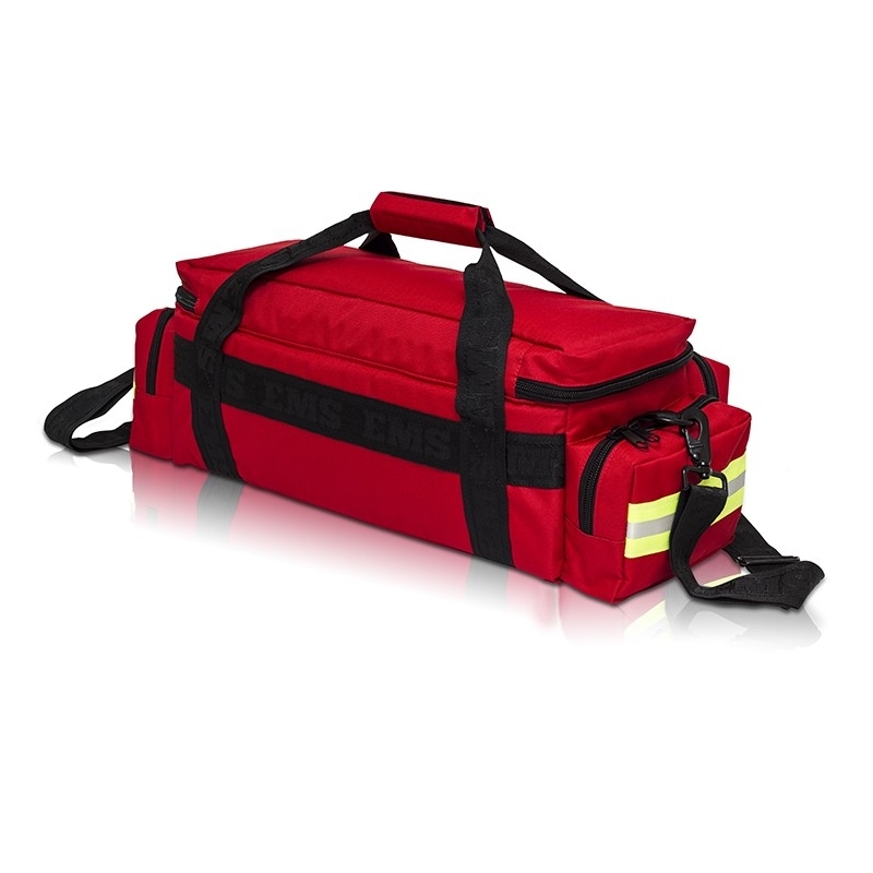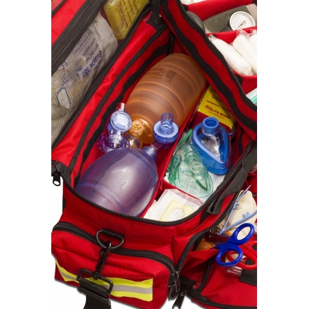 Sac d'urgence matelassé conçuu pour y mettre le matériel sanitaire lié à l'oxygénothérapie, divisé en 2 hauteurs à l'intérieur : plateau supérieur amovible avec séparatueurs réglables et partie inférieure avec 3 séparateurs pour y mettre la bouteille à oxygène. Dispose également de trois poches extérieures, deux à l'avant et un sous diaphanes divisé à l'intérieur avec des poches supplémentaires et des bandes élastiques.