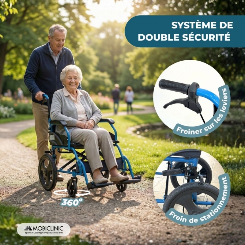 SYSTÈME DE FREINAGE DOUBLE : Ce système est doté de freins couplés agissant simultanément sur les deux roues arrière pour un arrêt en toute sécurité. Il comprend également un frein sur la poignée arrière, permettant ainsi à l’aidant de contrôler le fauteuil en toute confiance.