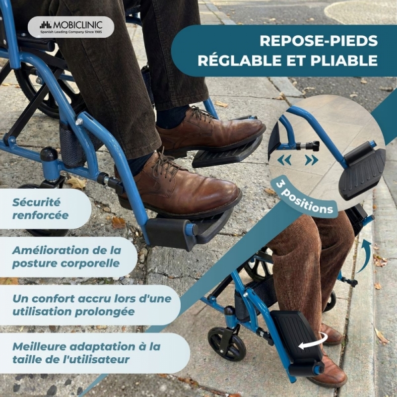 Les repose-pieds sont pliables et réglables, ce qui facilite l'accès au fauteuil et son rangement. Leur conception large assure une position confortable des jambes, et les sangles de maintien offrent un soutien et une stabilité accrus lors des déplacements.