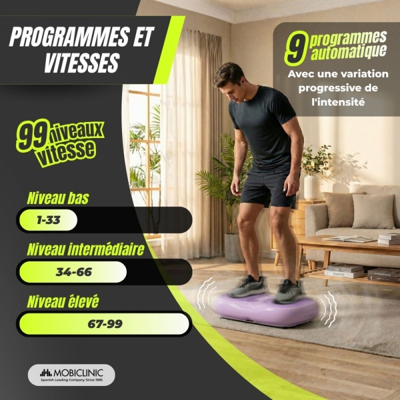ENTRAÎNEMENT PERSONNALISÉ : Cette plateforme vibrante possède 99 niveaux de vitesse, permettant un réglage de l’intensité beaucoup plus précis et s’adaptant aussi bien aux débutants qu’aux utilisateurs confirmés pour améliorer la force, la tonification et l’activation musculaire.