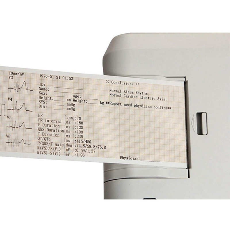 Les fonctions comprennent l'enregistrement et l'affichage des formes d'onde ECG en mode automatique et manuel, la mesure automatique, le diagnostic automatique des paramètres des formes d'onde ECG et la gestion des historiques en mémoire (1000 cas mémorisables). Il fournit des paramètres de mesure tels que HR, intervalle P-R, durée P, durée QRS, durée T, intervalle Q-T, Q-Tc, axe P, axe QRS, axe T, axe T, R (V5), S (V1), R (V5)+S (V1), etc. Il comprend également une fonction d'interprétation automatique pour aider le professionnel de la santé.
