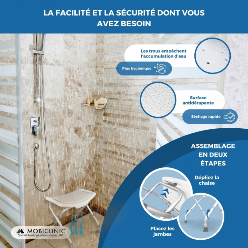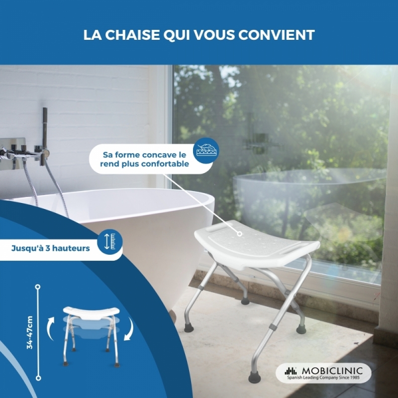 Grâce à son siège légèrement arqué, le tabouret de douche permet une meilleure posture, en évitant l'inconfort et en s'adaptant légèrement au corps des personnes âgées.