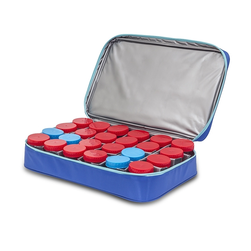 Sac isotherme de grande capacité conçu pour transporter de manière ordonnée et dans des conditions de température optimales jusqu'à un total de 300 échantillons de diagnostic et 36 bidons d'urine ou de fèces.