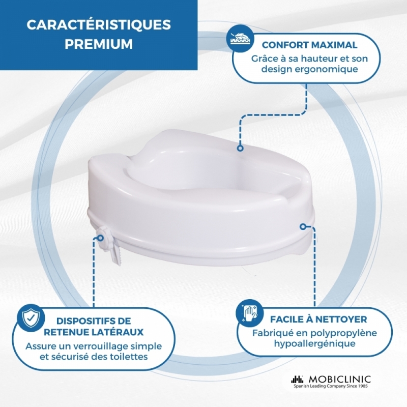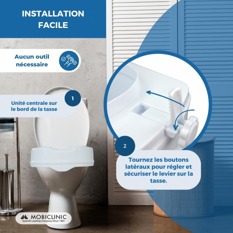 C'est un rehausseur de toilette discret et respecte parfaitement l'esthétique de la salle de bain en passant complètement inaperçu. Son système de fixation universel s'adapte à presque toutes les toilettes.