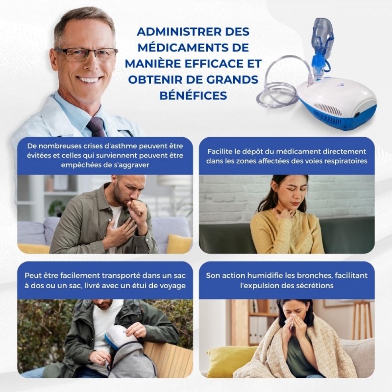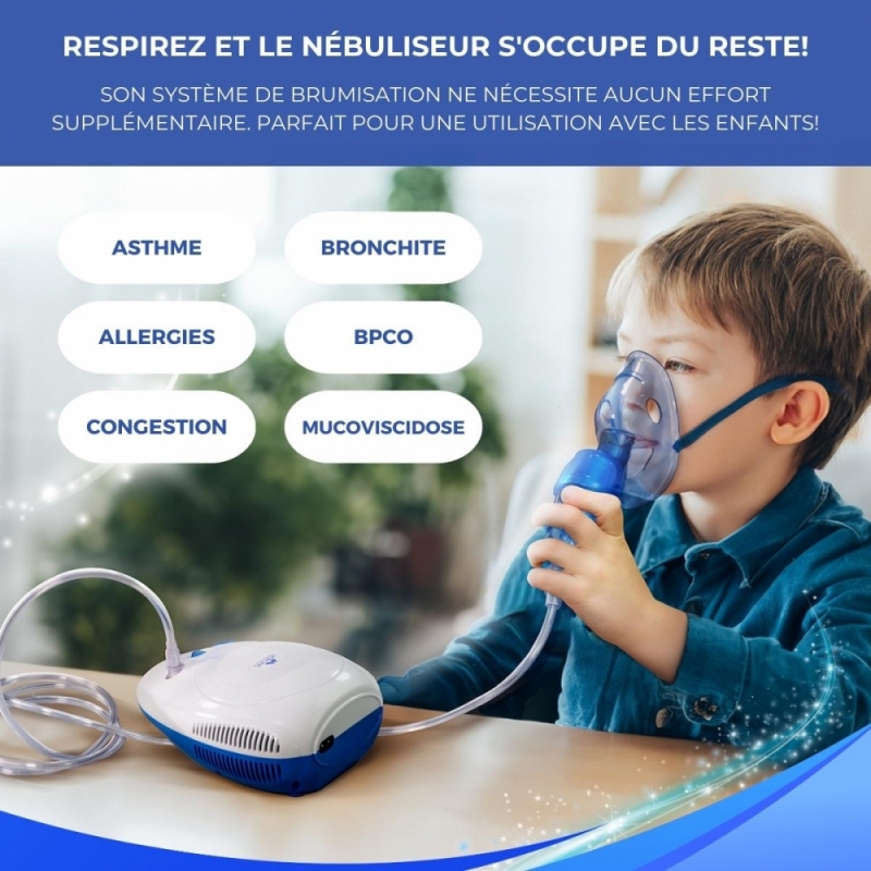 Le nébuliseur est un appareil électrique qui convertit le médicament en un brouillard mou qui est inhalé et atteint les voies respiratoires par l'air comprimé, permettant ainsi une récupération rapide.