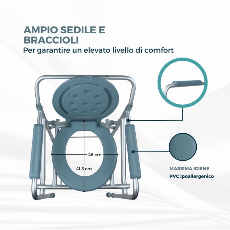 - La sedia wc anziani è inoltre dotata di comodi braccioli e di un sedile con foro e coperchio.