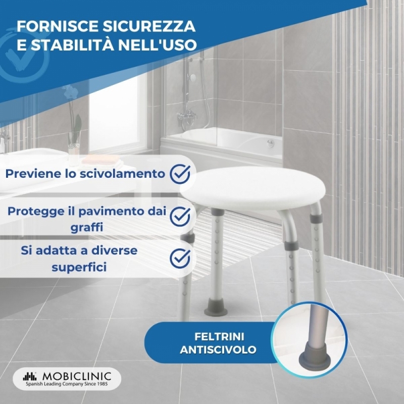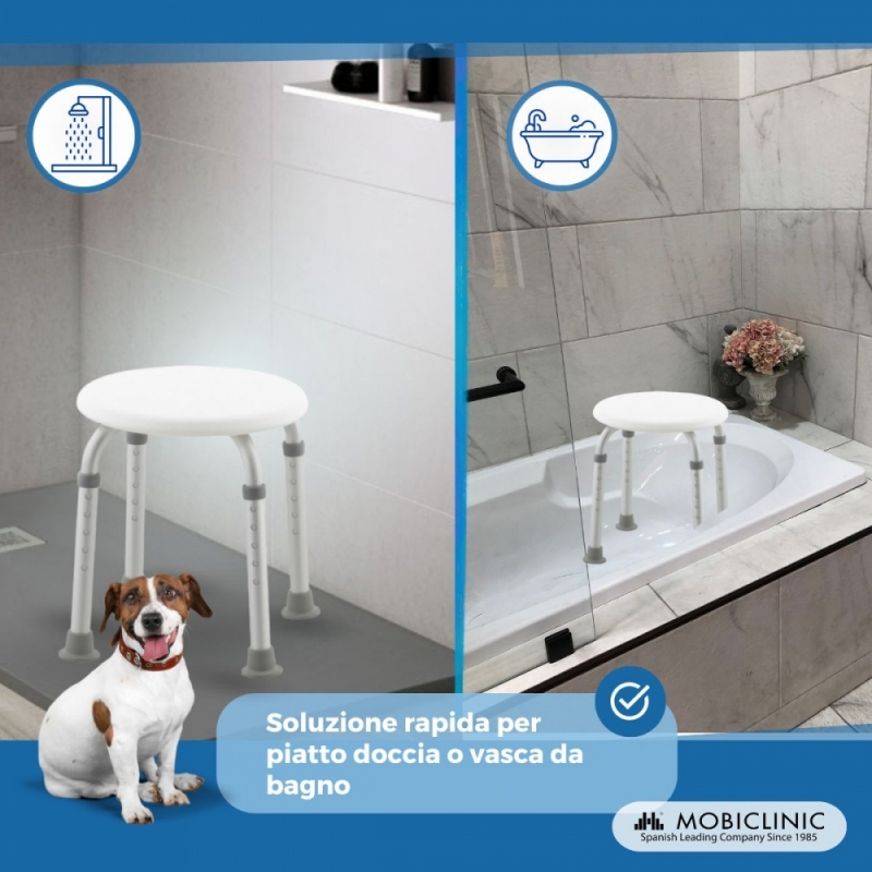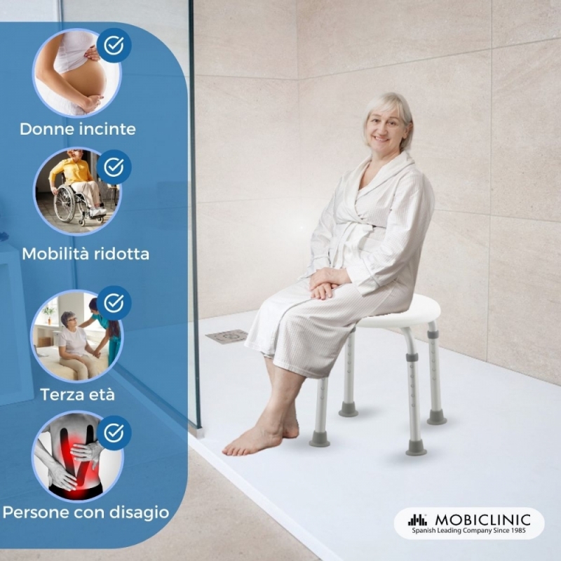 Gli sgabelli bagno sono raccomandati ad anziani, disabili, a persone con mobilità ridotta o che hanno qualche difficoltà a stare in piedi molto tempo. È anche adatto a bambini, poiché facilita i genitori al momento di lavarli. In generale, può essere utilizzato da tutti i membri della famiglia, per favorire il riposo durante l’igiene quotidiana, grazie alla robustezza e stabilità del nostro seggiolino per doccia.