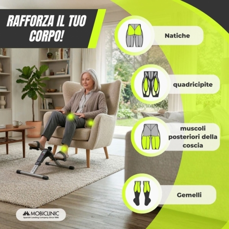 RESISTENZA REGOLABILE SENZA ELETTRICITÀ : consente la regolazione manuale dell'intensità della pedalata tramite una manopola centrale, adattandosi alle esigenze di ogni utente senza bisogno di spine o cavi.