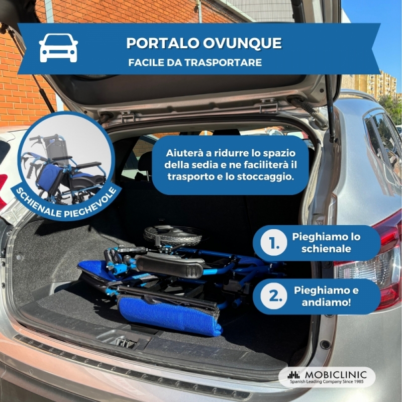 Grazie al telaio pieghevole della sedia a rotelle, sarà possibile passare in spazi stretti e non occuperà molto spazio in casa.