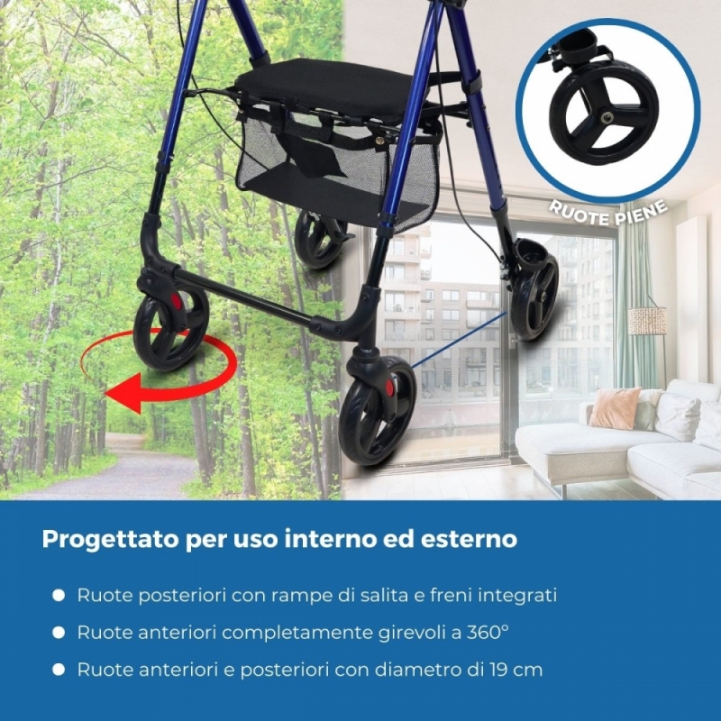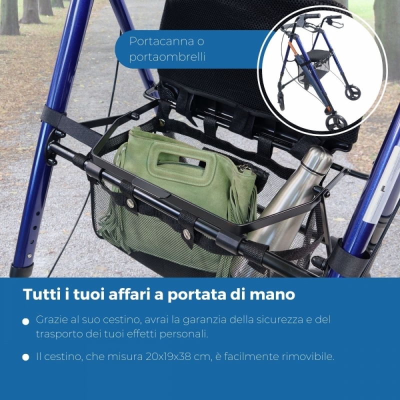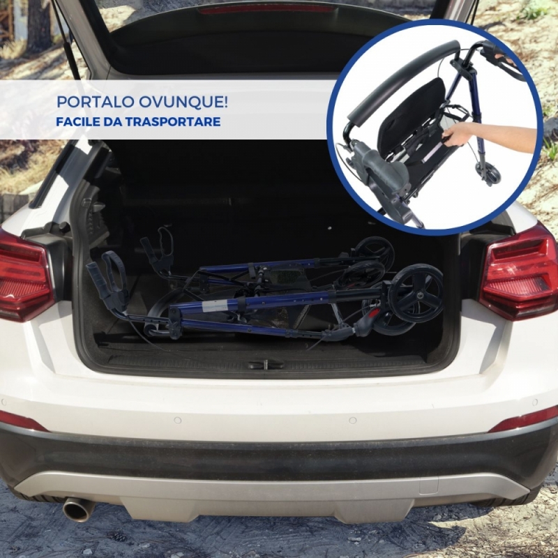 PIEGHEVOLE: Trattandosi di un deambulatore pieghevole, l'utente può piegarlo per riporlo a casa o per trasportarlo nel bagagliaio dell'auto, permettendo così di trasportarlo e riporlo ovunque con facilità.