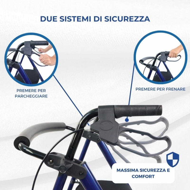 FACILE DA BLOCCARE: Se è necessario immobilizzare completamente il deambulatore, è necessario abbassare le leve dei freni e le ruote verranno bloccate. Per sbloccare basta tirare le maniglie verso l'alto.