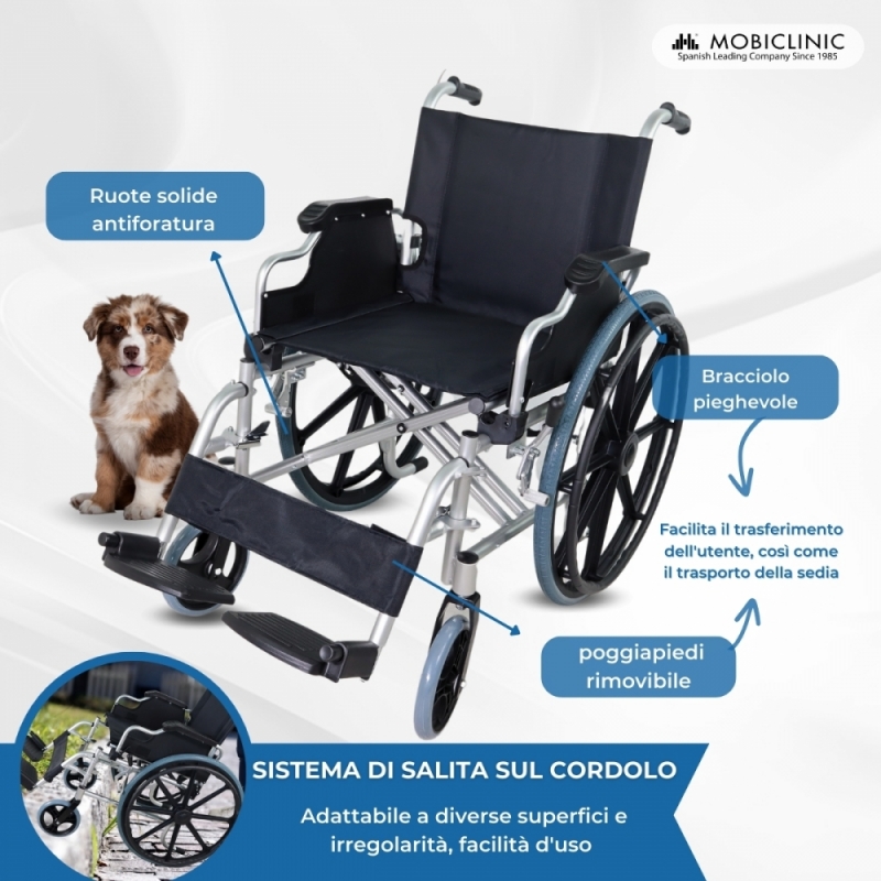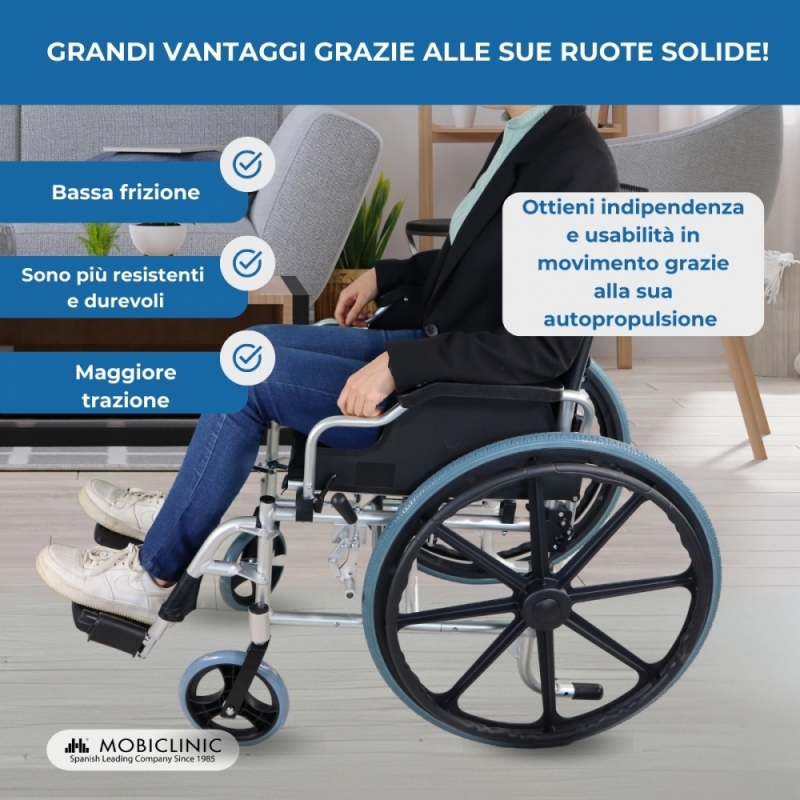 Le sue ruote da 20,5 e 58,5 cm di diametro facilitano il lavoro dell'accompagnatore, poiché gli permette di affrontare lunghi viaggi senza complicazioni, oltre ad essere una comoda sedia a rotelle . Ha quattro ruote solide e raggi MAG.