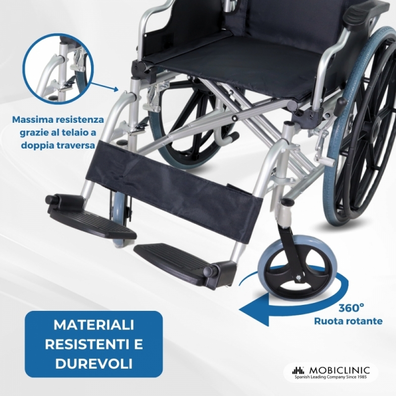 Questa sedia a rotelle per anziani è realizzata in alluminio leggero ad alta resistenza, che garantisce grande robustezza e leggerezza.