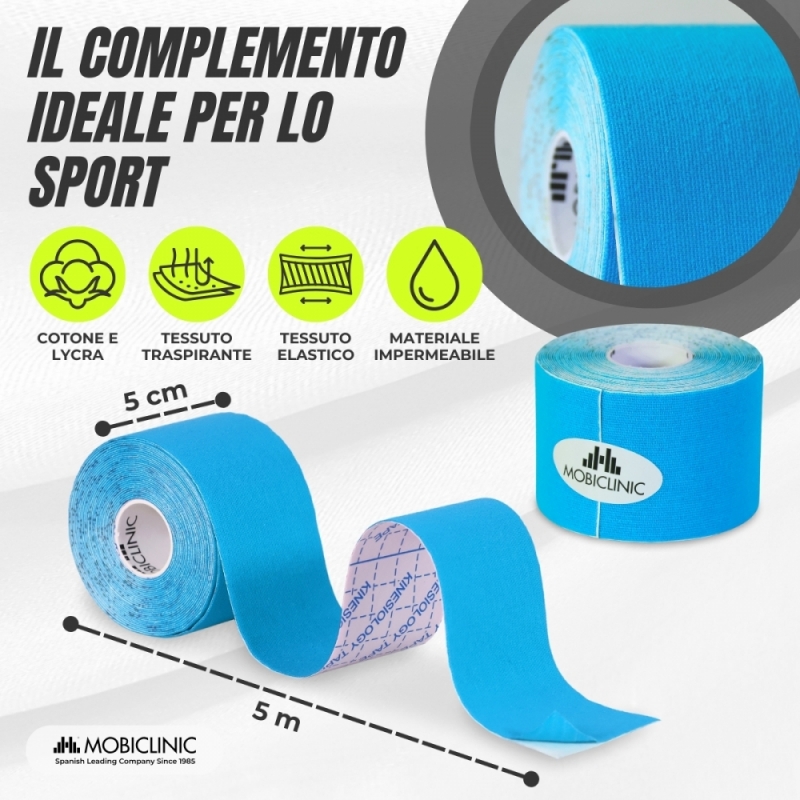 Questo nastro kinesiologico ha una dimensione di 5 cm di larghezza x 5 m di lunghezza, inoltre questo prodotto è disponibile in vari colori in risposta a tutti quei terapisti che sostengono i benefici della cromoterapia applicata a questo tipo di prodotto.