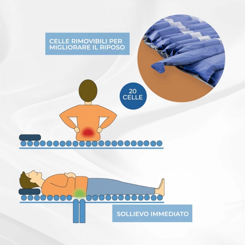 EFFICACIA TERAPEUTICA: Con le sue 20 celle che si gonfiano e sgonfiano in periodi compresi tra 6 e 8 minuti, questo materasso ortopedico aiuta a ridurre il dolore del paziente e ad alleviare la pressione generata dalla posizione sdraiata per lunghi periodi di tempo. Migliora la circolazione sanguigna e aiuta a ridurre l'attrito con il materasso ad aria e la comparsa di piaghe da decubito.