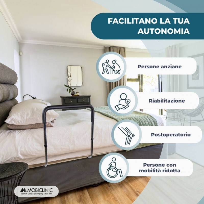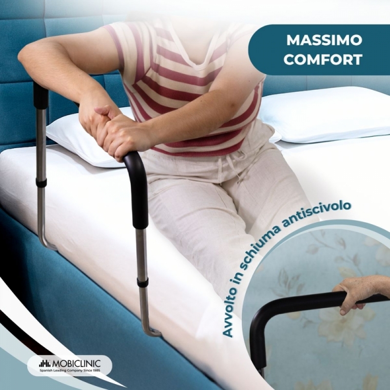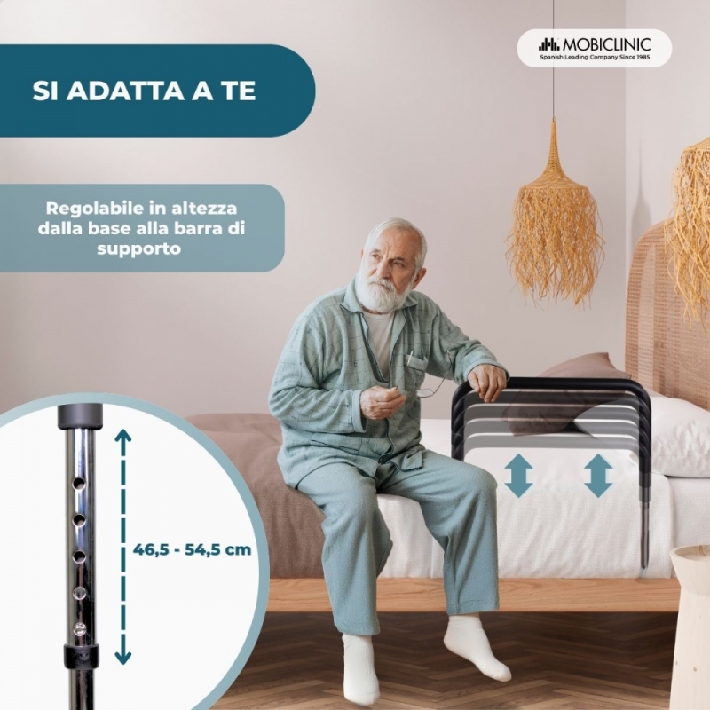 Questa sponda per letto è progettata per garantire comfort, autonomia e sicurezza alle persone con mobilità ridotta. Il suo design ergonomico offre un supporto saldo e stabile per salire a letto senza sforzo e con maggiore autonomia. L'altezza è regolabile, permettendo di adattarsi a diversi modelli di letti tradizionali (singoli, matrimoniali o matrimoniali) e alle diverse esigenze dell'utente.