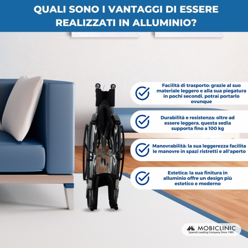MOLTO LEGGERE : grazie alla loro fabbricazione in alluminio, le nostre sedie a rotelle ultraleggere consentono una maggiore mobilità.