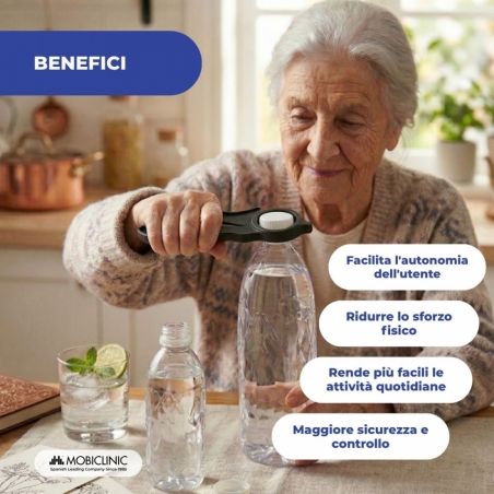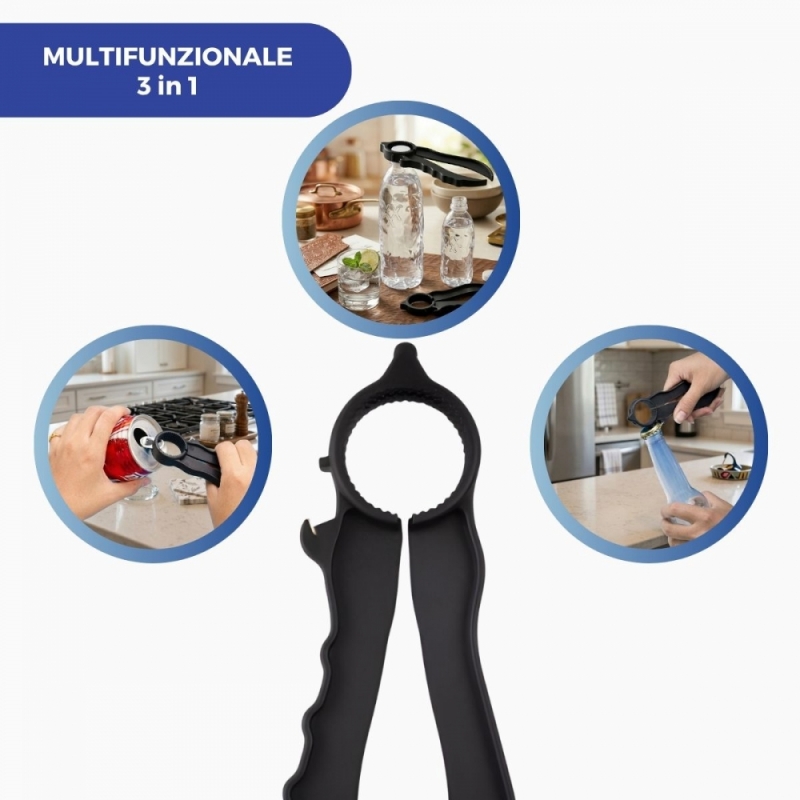 Il nostro apritappi in plastica antiscivolo, permette di aprire lattine e tappi a vite o di metallo. Il suo facile utilizzo, lo rende un utensile da cucina perfetto per persone con poca forza o che soffrono di problemi alle articolazioni superiori.