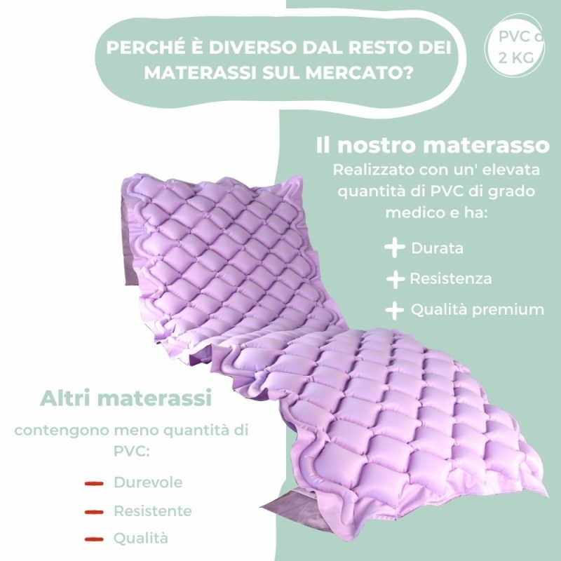 Le sue 130 singole celle si gonfiano e si sgonfiano alternativamente per periodi di 6 minuti e in questo modo il paziente riceverà un costante sollievo dalla pressione . Questa pressione, distribuita sulla struttura mediante l'alternanza delle cellule, attiva la circolazione e previene la formazione di piaghe da decubito.