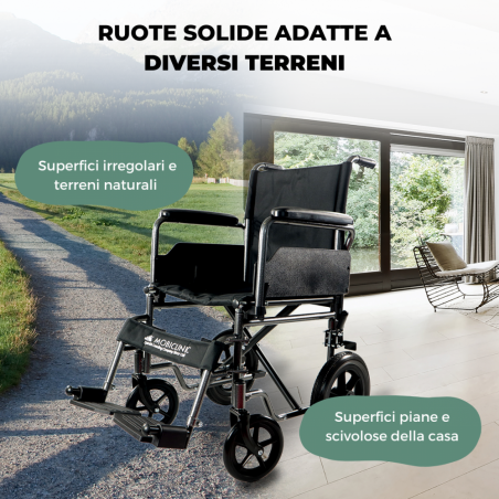 Inoltre, la carrozzella da passeggio è pieghevole per un facile trasporto e stoccaggio, rendendola una sedia a rotelle leggera. E se questo non bastasse, le sue ruote sono piccole e solide, sinonimo di durata e sicurezza, caratteristiche che la rendono una sedia a rotelle comoda facile da usare. Inoltre, sicurezza totale quando si tratta di prevenire le cadute e creare un maggior grado di autonomia e indipendenza per l'utente.