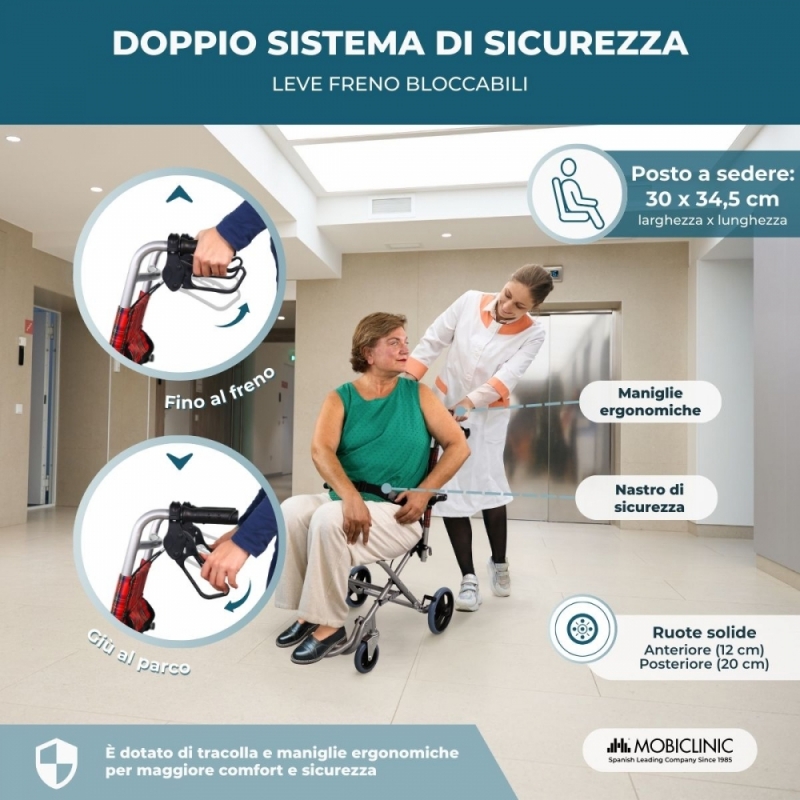 La sedia a rotelle Neptuno è il prodotto di mobilità perfetto per trasferimenti rapidi e sicuri. Una sedia a rotelle da transito che vi permetterà di fare brevi viaggi in modo rapido, comodo e sicuro. Si tratta di una carrozzina per anziani pensata per un uso occasionale e per spostamenti di breve durata.