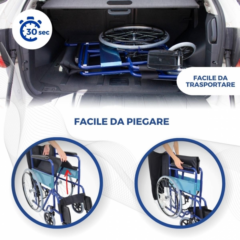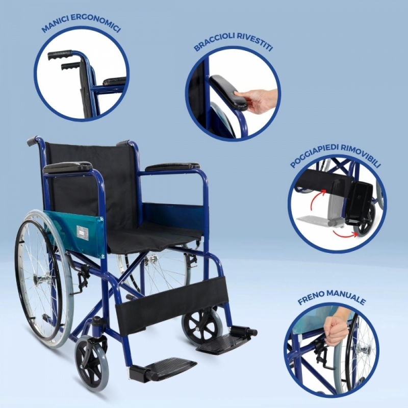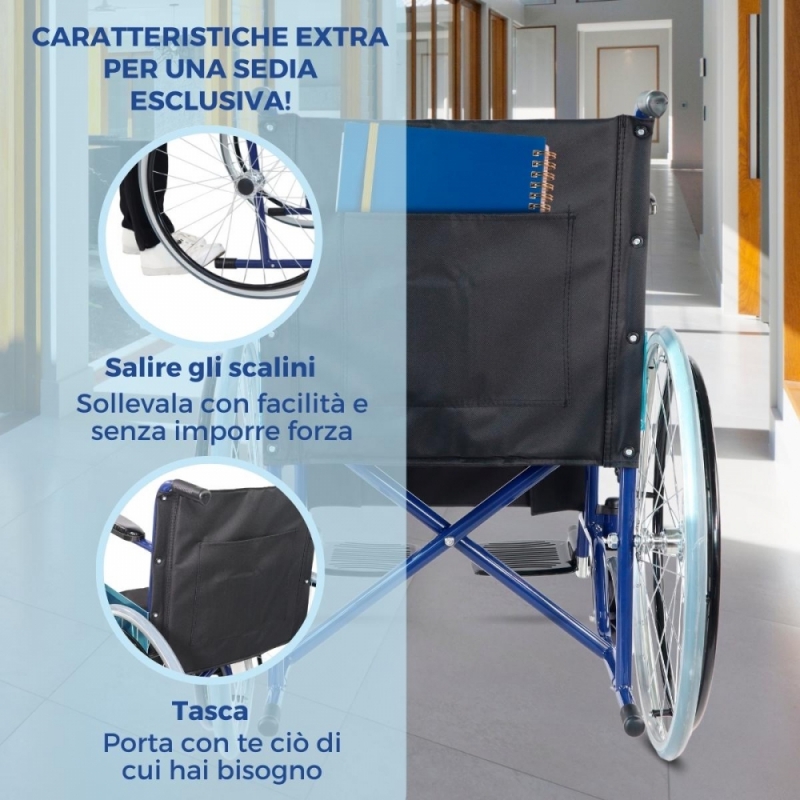 È una carrozzina da trasferimento che ha una grande autonomia con ruote che riducono lo sforzo e freni manuali che impediscono il ribaltamento.