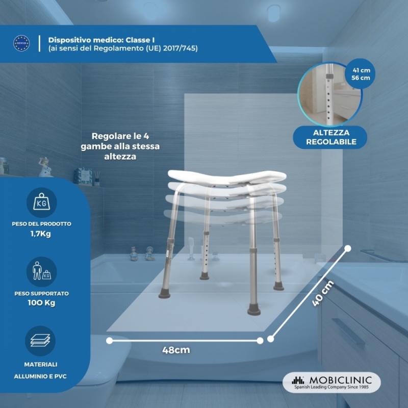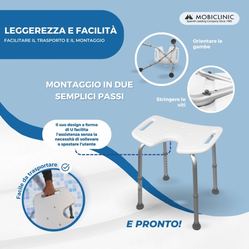 - La sua struttura in alluminio e la seduta in PVC, fanno dello sgabello doccia disabili un mobile molto leggero, ma anche robusto e resistente, poiché fabbricato con materiali di prima qualità.