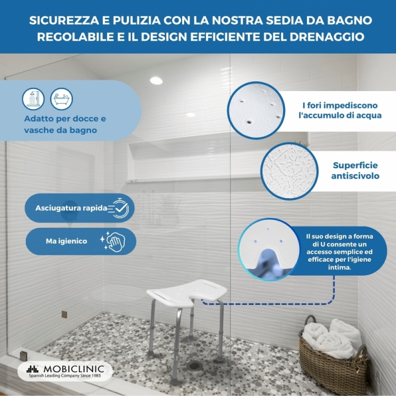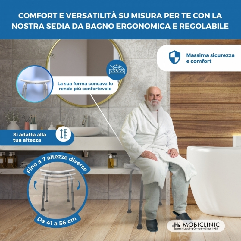 - La seduta ergonomica dello sgabello x doccia è igienica, facilmente lavabile e permette il drenaggio dei liquidi grazie ai fori situati sulla seduta.