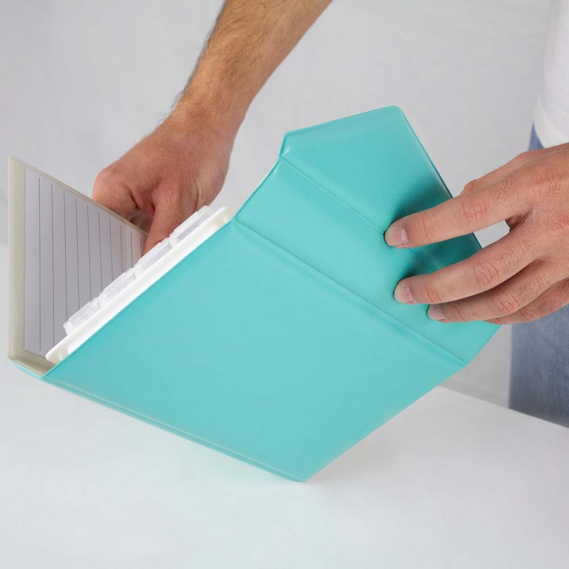 Il portacompresse settimanale è inserito in un astuccio che contiene anche un taccuino di 8 pagine, un posto per le penne e un portatessera.