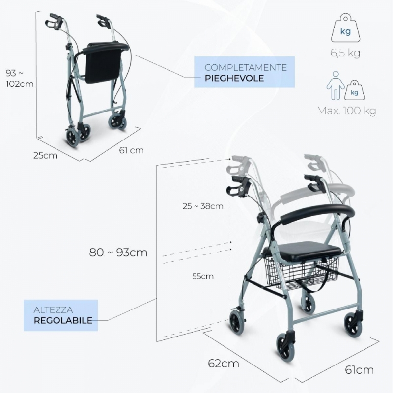 Caratteristiche tecniche del deambulatore pieghevole: