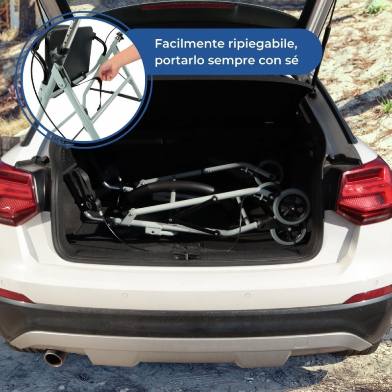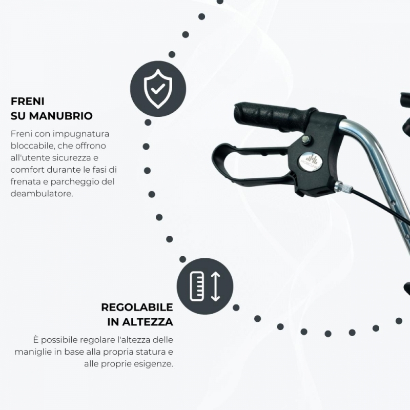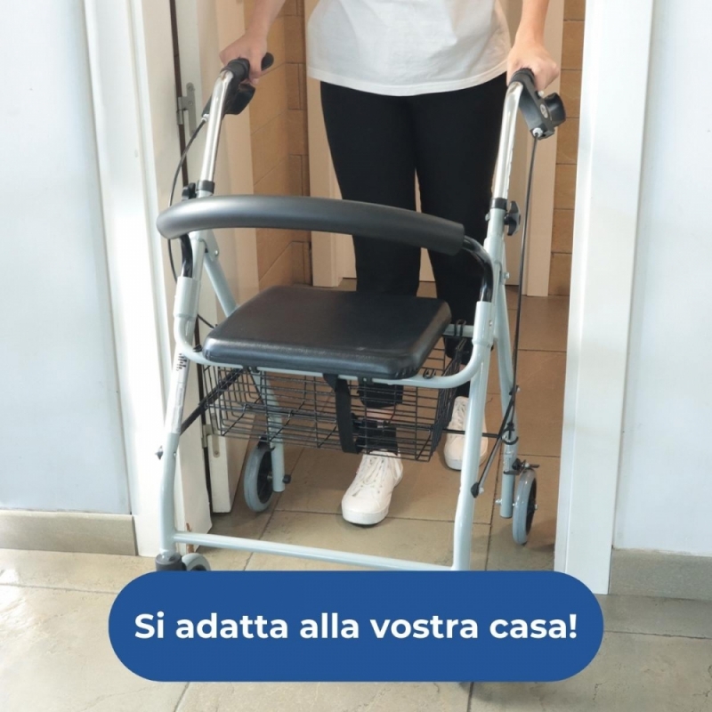 - Deambulatore con 4 ruote progettate per superare comodamente i piccoli ostacoli sia all'interno che all'esterno.