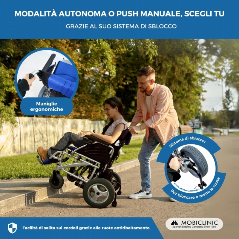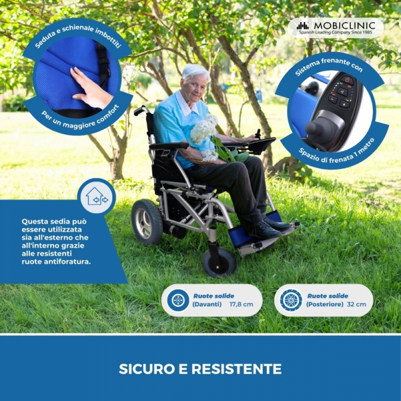 Grazie alla sua finitura in alluminio e al design pieghevole (per piegarla, è necessario rimuovere le batterie), rendono questa sedia a rotelle motorizzata molto leggera e facile da trasportare e conservare.
