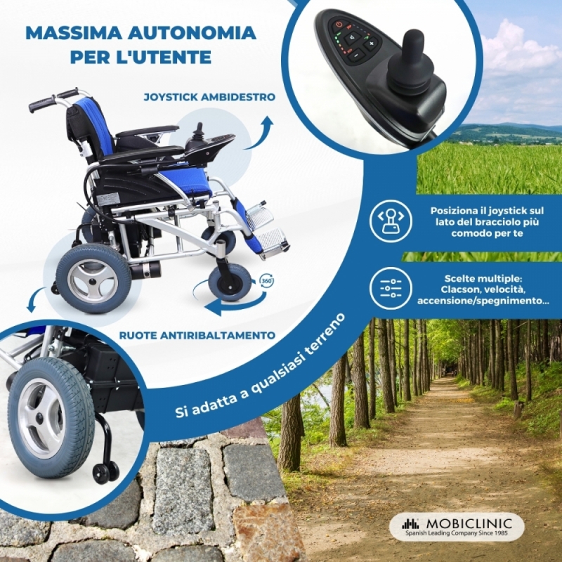SEDIA ULTRALEGGERA: il materiale di questa sedia a rotelle in alluminio la rende molto leggera, consentendo una mobilità più facile. Con un peso totale di 50 kg (batterie incluse) è in grado di sostenere fino a 120 kg di peso.