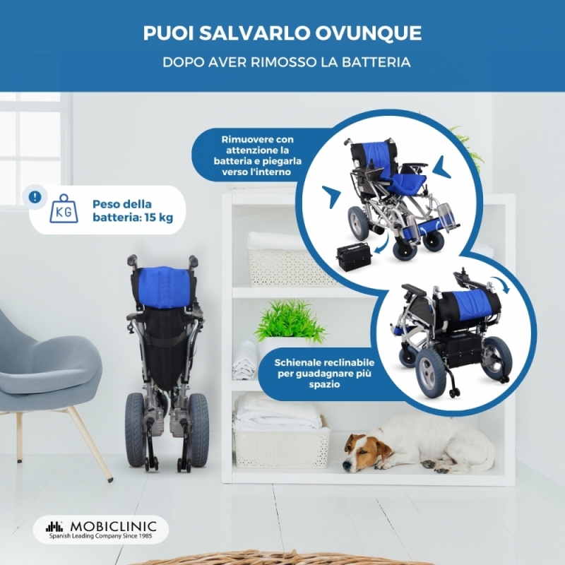 PIEGHEVOLE: questa carrozzina elettrica è pieghevole (rimuovendo le sue batterie), in questo modo può essere trasportata e riposta con totale facilità.