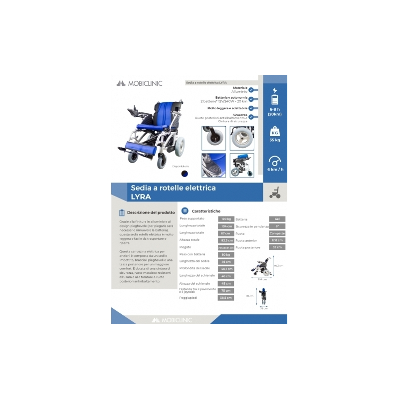 La sedia a rotelle elettrica modello Lyra garantisce l'indipendenza dell'utente nella sua quotidianità migliorando così lo stile di vita. Si tratta di una carrozzina elettrica pieghevole per le persone con mobilità ridotta o anziani.