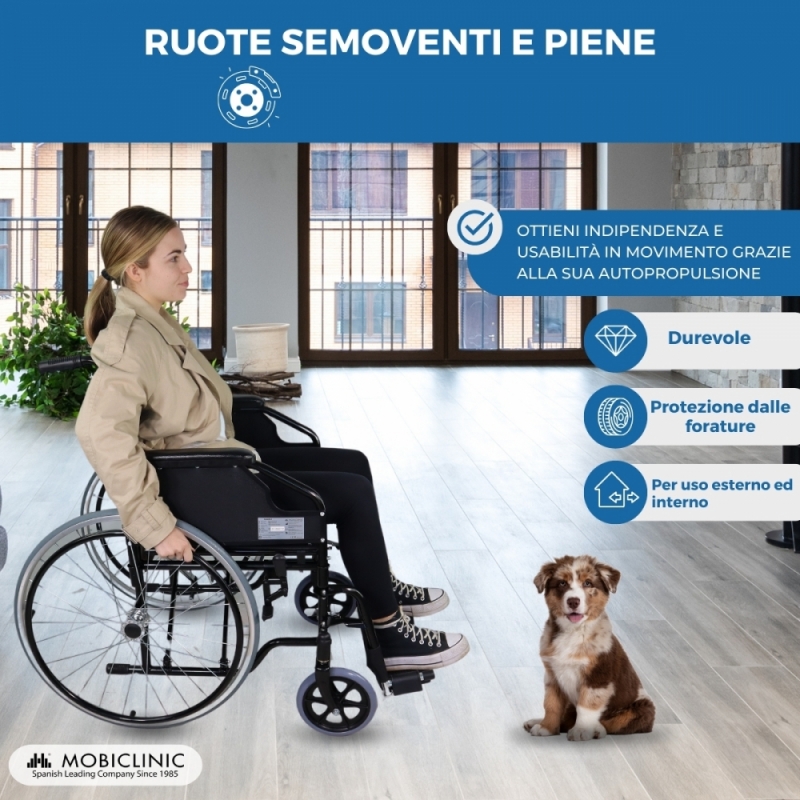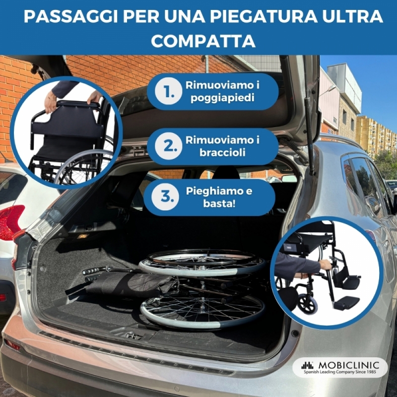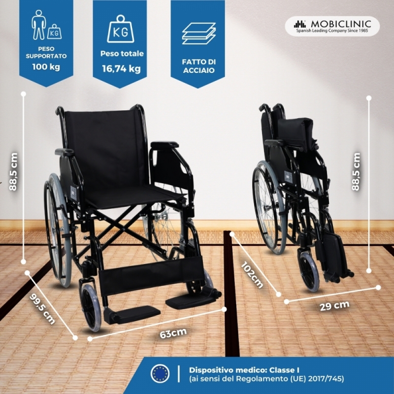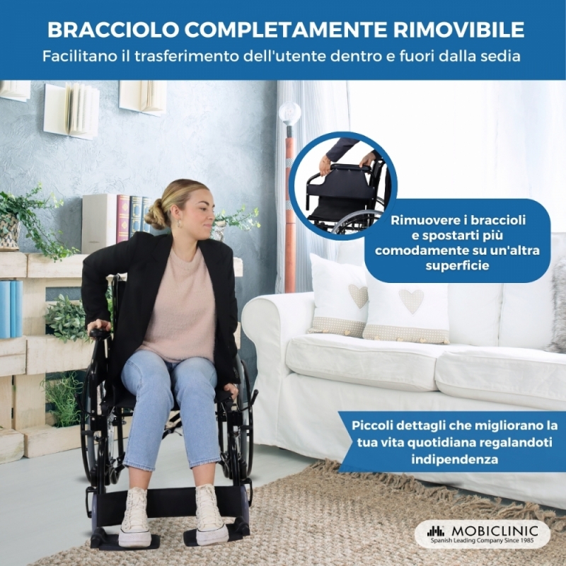 In poche parole, è la carrozzina di trasferimento ideale per chi cerca tutti questi requisiti ed è creata per un uso frequente o occasionale di una singola persona fino a 100 kg. Può essere usata sia all'interno che all'esterno e può essere spostata sia in avanti che all'indietro.