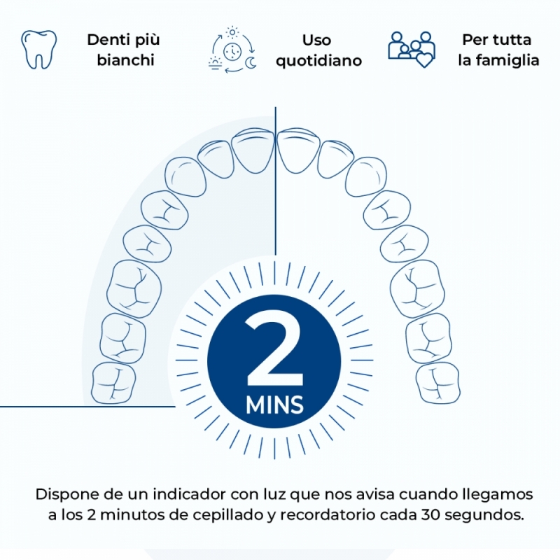 Ha un indicatore luminoso che ci avverte quando raggiungiamo i 2 minuti di spazzolamento e ha un avvisto luminoso ogni 30 secondi. Ha una velocità di rotazione di 8.000 giri al minuto ed è impermeabile, evitando inutili rischi in bagno.