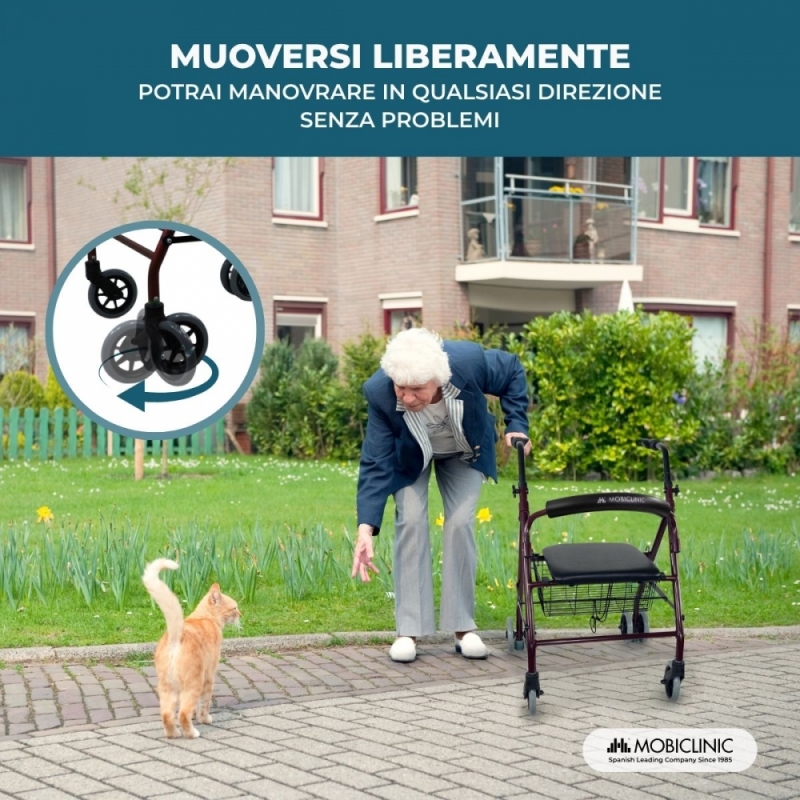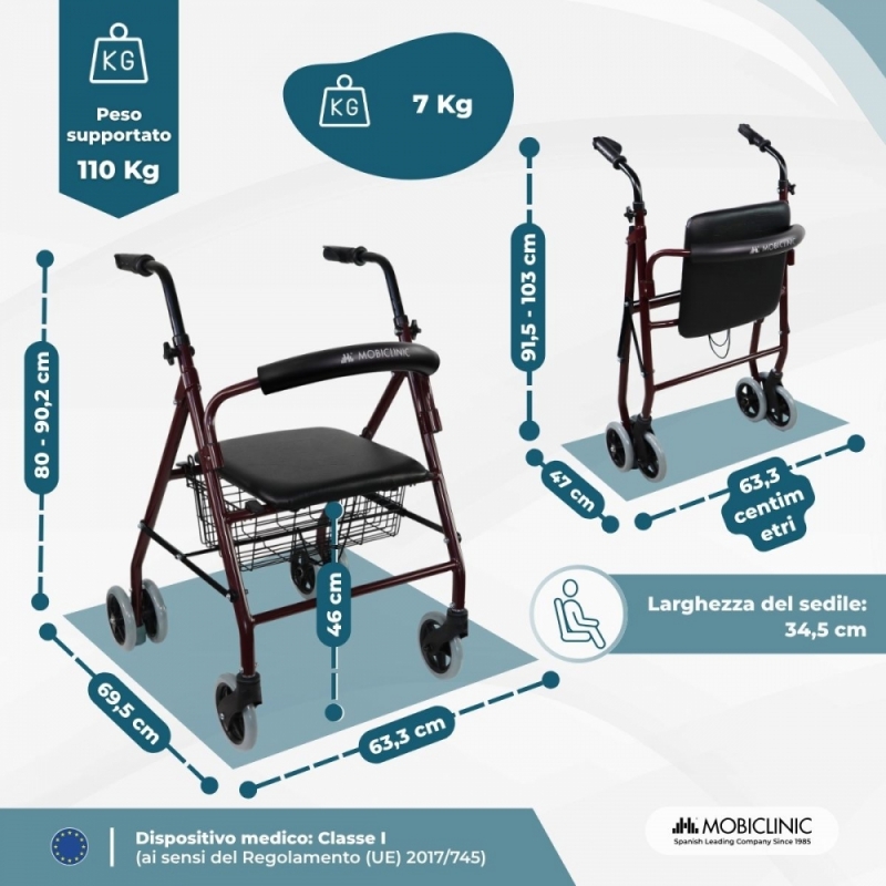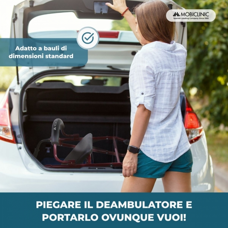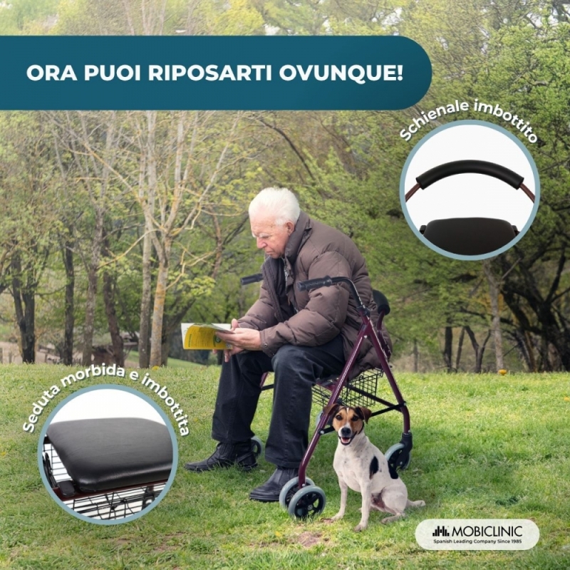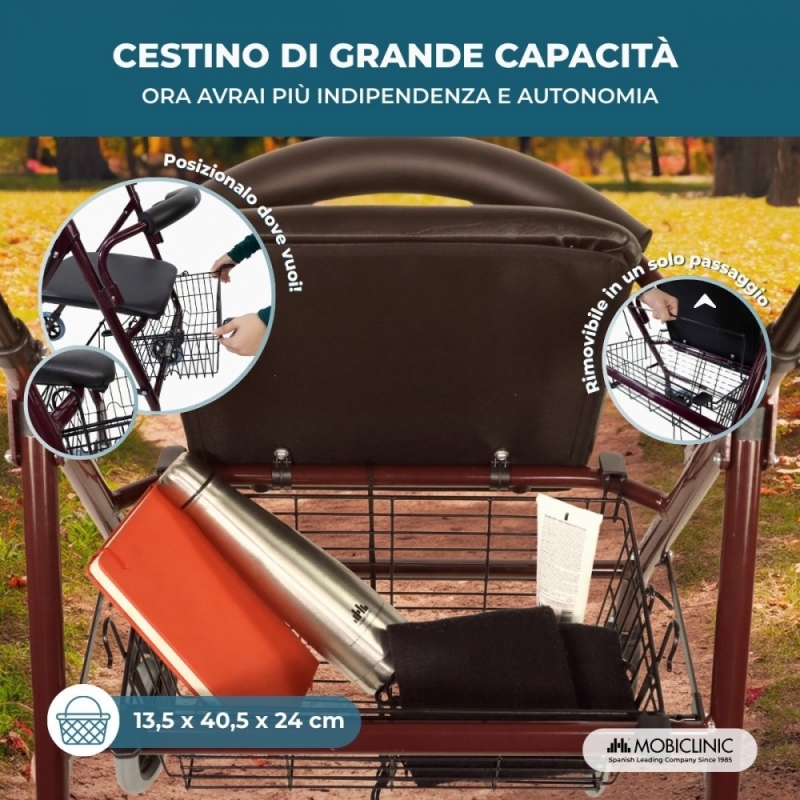 Deambulatore pieghevole | Seduta e schienale | Alluminio | Cesta | Per anziani | Bordeaux| Prado | Mobiclinic