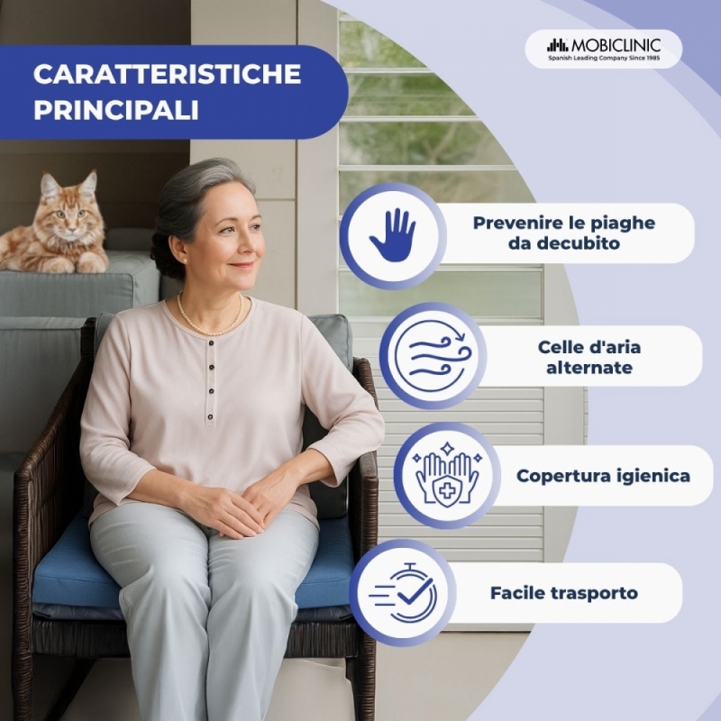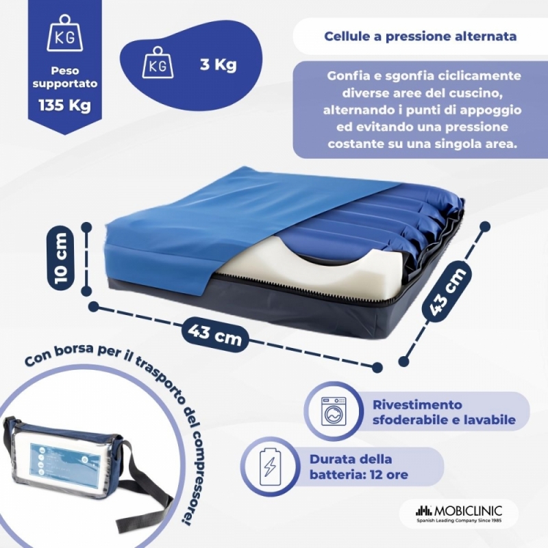 FUNZIONAMENTO: il cuscino ad aria antidecubito funziona tramite una batteria agli ioni di litio fino a 12 ore.