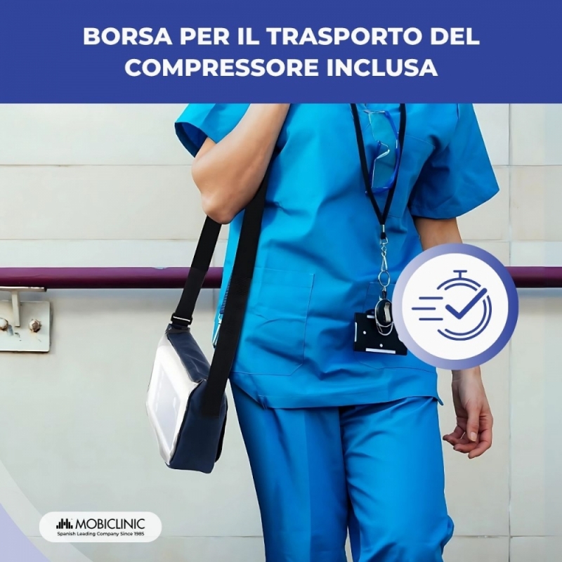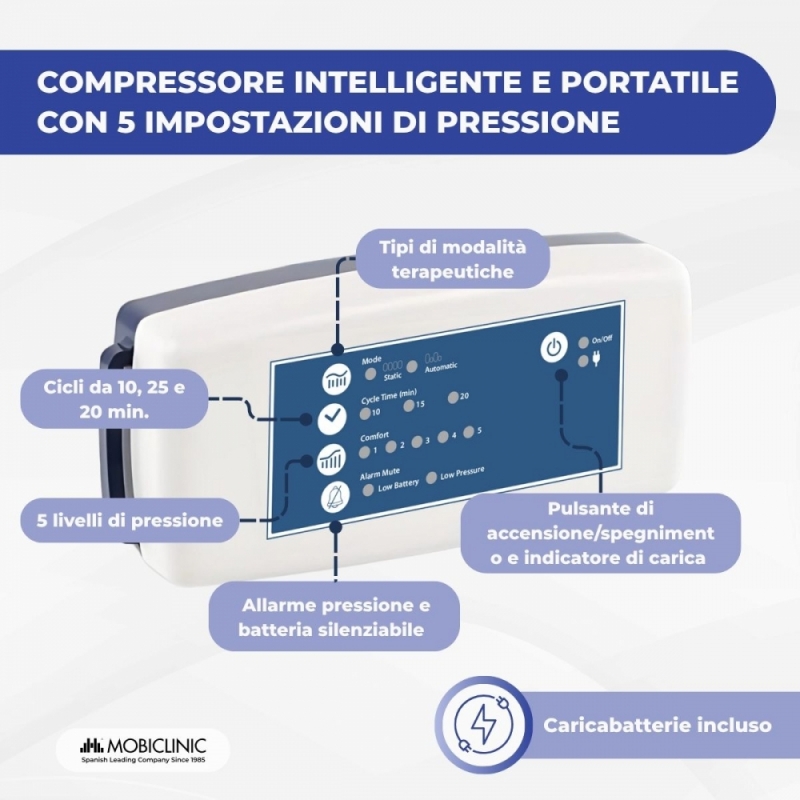 La pressione delle sue celle può essere alternata, grazie al telecomando incluso nel compressore. Il compressore è facile da usare e può essere regolato in 5 diverse modalità di alternanza di pressione, per il comfort del paziente. Ha un sistema di allarme per bassa pressione e batteria scarica.