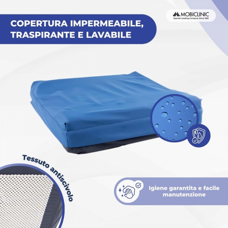 È possibile posizionare questo cuscino antidecubito ovunque desideri, anche se è particolarmente adatto per sedie a rotelle, date le sue dimensioni di 43 x 43 x 10 cm, il che lo rende adatto alla maggior parte delle sedie. Include anche una fodera esterna protettiva, impermeabile e facile da lavare.