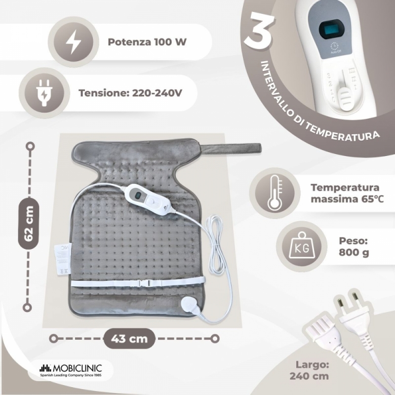 Vi offriamo un cuscinetto elettrico dorsale e cervicale intelligente, termico e ortopedico per fisioterapia di 62x43 cm. che non solo vi fornirà calore ed ergonomia, ma vi aiuterà anche ad alleviare i dolori muscolari, lombalgici, cervicali, dorsali, traumatici e di artrite reumatoide o reumatica. In molti casi questi dolori sono dovuti a stress, ansia o altri problemi.