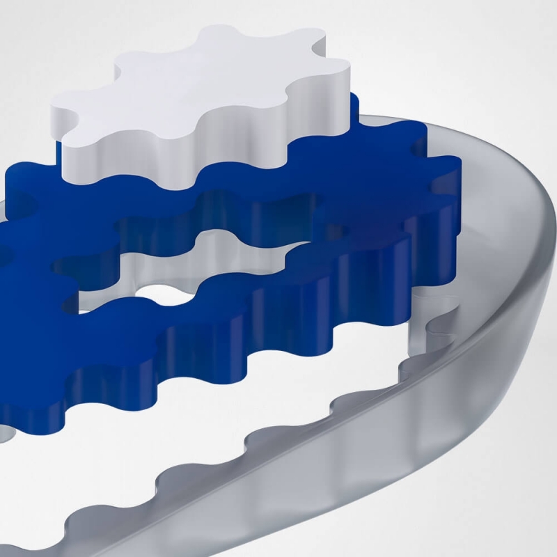 Ha tre zone di durezza differente che assicurano il giusto sollievo: all'interno c'è un punto bianco, una zona particolarmente morbida che assorbe la pressione del centro del dolore, la zona sensibile direttamente intorno allo sperone del tallone. La zona blu intorno al punto bianco è un po' più dura e scarica la fascia plantare e la incava. La zona grigia dura sul bordo esterno guida delicatamente il piede quando si fa un passo e lo sostiene quando si cammina.