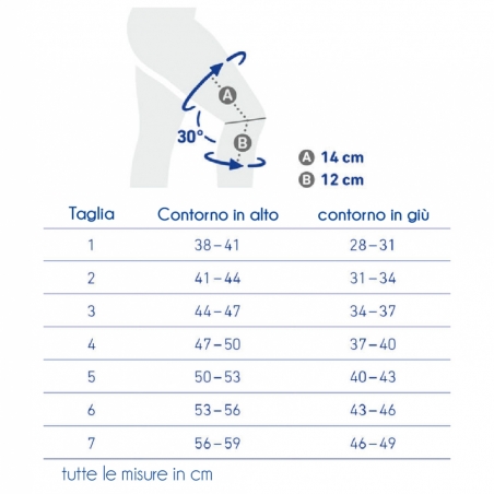 Tutore per il ginocchio in tessuto elastico e design anatomico, con cinturini laterali e cuscinetto viscoelastico integrato nel tessuto che circonda la rotula, esercitando un massaggio per il riassorbimento di edemi ed ematomi. Il tessuto viene compresso per stimolare la propriocezione e facilitare il recupero dell'articolazione. Ha un sistema di cinghie inelastiche con chiusura in velcro per una maggiore stabilità.